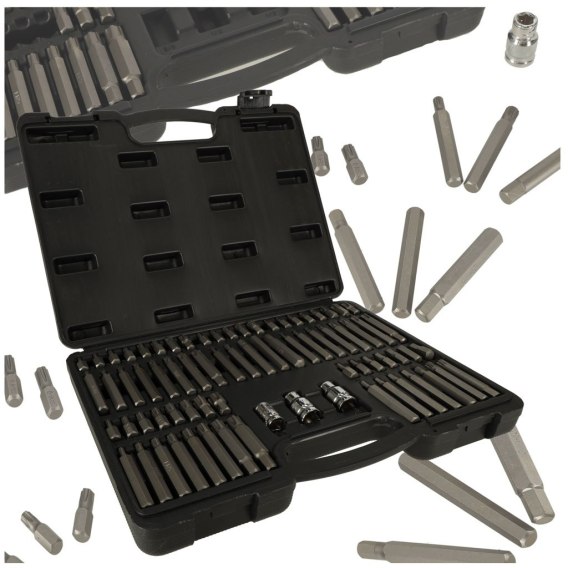 Dzięki różnym rodzajom bitów, takim jak RIBE, HEX, SPLINE, STAR i TAMPER PROOF STAR, oraz różnym rozmiarom i długościom, będziesz przygotowany na odkręcanie i dokręcanie różnych rodzajów śrub. Zestaw zawiera także trzy przejściówki - jedną 3/8" i dwie 1/2", co dodatkowo zwiększa jego wszechstronność.